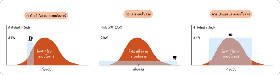 แม้เครื่องใช้ไฟฟ้าและการใช้ไฟฟ้าไม่ได้เป็นส่วนหนึ่งของระบบโซลาร์ แต่ถือเป็นองค์ประกอบสำคัญที่มีผลต่อการทำงานของระบบโซลาร์อย่างมาก หากไม่มีการใช้ไฟฟ้าในช่วงที่ระบบโซลาร์ผลิตไฟฟ้าได้ปริมาณมาก ย่อมเสียโอกาสในการประหยัดค่าไฟ ณ ช่วงเวลานั้นไป เว้นแต่ว่าจะมีการขายไฟให้การไฟฟ้า (ศึกษาเรื่องการขายไฟให้การไฟฟ้าได้ในส่วนใบอนุญาต)