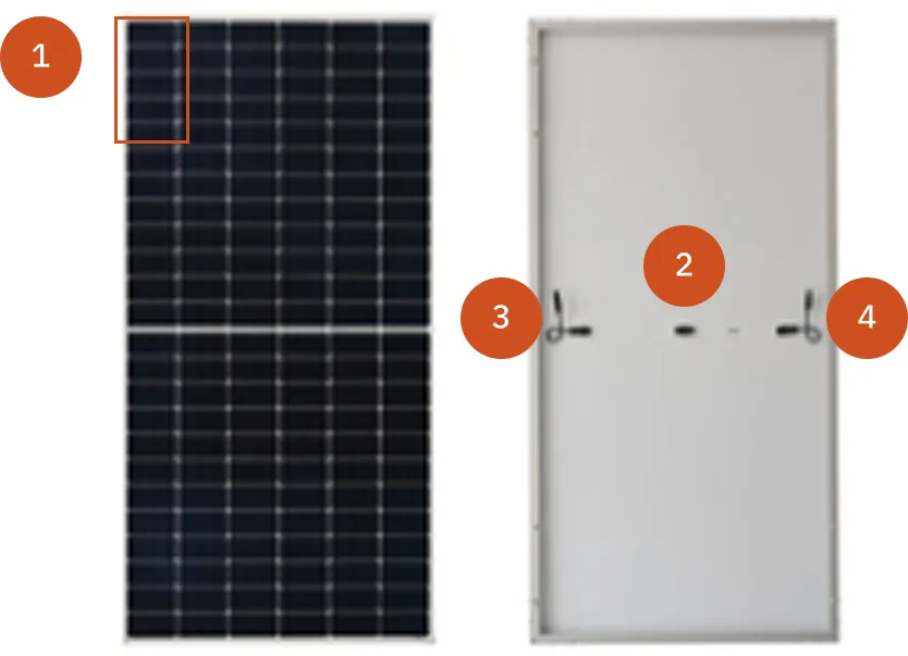 แผงโซลาร์ประกอบไปด้วยตัวเซลล์แสงอาทิตย์ (1) หลายเซลล์ที่ต่ออนุกรมกัน และถูกเคลือบป้องกันด้วยแผ่นกระจกใส โดยไฟทั้งหมดจะไหลผ่าน junction box (2) และออกมาเป็นขั้วบวก (3) และขั้วลบ (4)