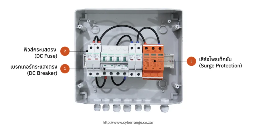 ก่อนจะป้อนไฟฟ้าเข้าไปยังอินเวอร์เตอร์ จำเป็นต้องมีระบบป้องกันคั่นกลาง นั่นก็คือ ระบบป้องกันด้านกระแสตรง ภายในมีอุปกรณ์ทำหน้าที่ตัดไฟเรียกว่า เบรคเกอร์กระแสตรง (1) อุปกรณ์ป้องกันไฟเกินเรียกว่าฟิวส์ (2) และอุปกรณ์ป้องกันกระแสไฟจากฟ้าผ่าหรือเสิร์จ โพรเท็กชั่น (3) (ส่วนประกอบนี้ไม่ใช่เครื่องป้องกันไฟดูด หากเผลอจับสายไฟหลังจากผ่าน DC Panel แล้ว เสี่ยงถูกไฟช็อตได้)