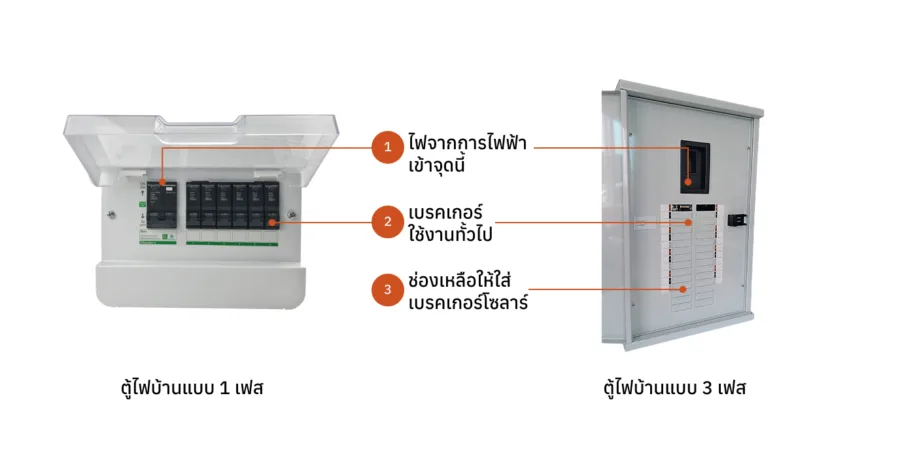 เป็นจุดที่ไฟฟ้าของระบบโซลาร์จะมาจ่ายให้ไฟบ้าน โดย Consumer unit นั้นคือตู้ไฟเดิมในบ้านที่เชื่อมต่อระบบโซลาร์กับช่องเบรคเกอร์ที่ยังว่างอยู่