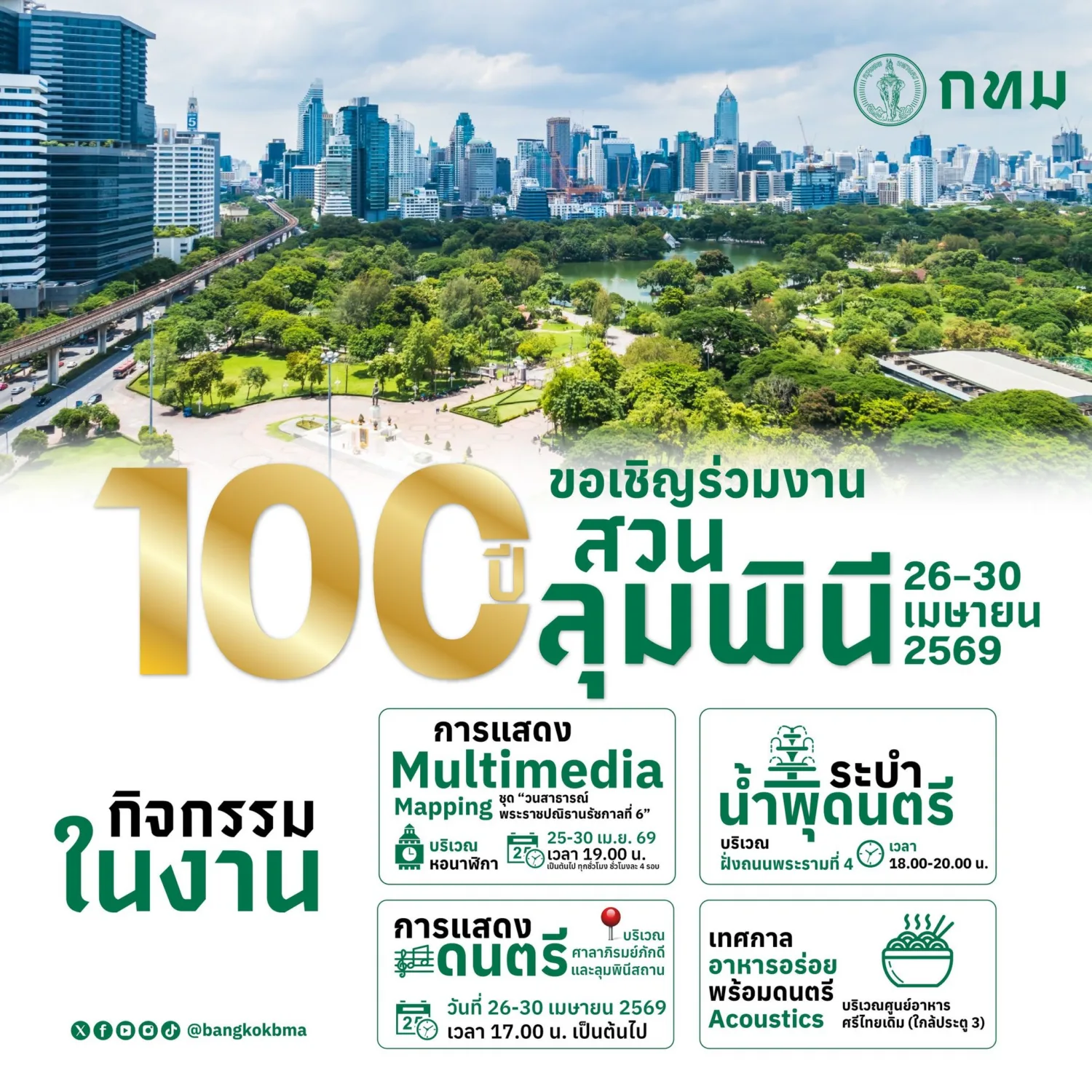 ตื่นตาตื่นใจกับแสดงไฮไลท์ของงานการแสดง Multimedia Mapping ชุด “วนะสาธารณ์ พระราชปณิธานราชกาลที่ 6” บนหอนาฬิกา ซึ่งเป็นสัญลักษณ์สำคัญของสวนลุมพินี โดยจะมีการฉายภาพแสงสีเสียงเล่าเรื่องราว “ศิลาจารึกแห่งกาลเวลา” อุ่นเครื่องสู่ขบวนงานฉลอง 100 ปี สวนลุมพินีอย่างเต็มรูปแบบ ระยะเวลาจัดแสดง: 25 – 30 เมษายน 2569 รอบการแสดง: เริ่ม 19.00 น. เป็นต้นไป (ฉายทุกชั่วโมง ชั่วโมงละ 4 รอบ)